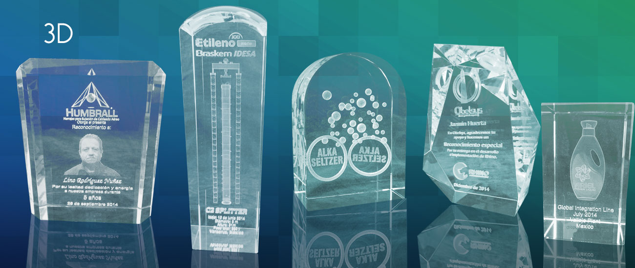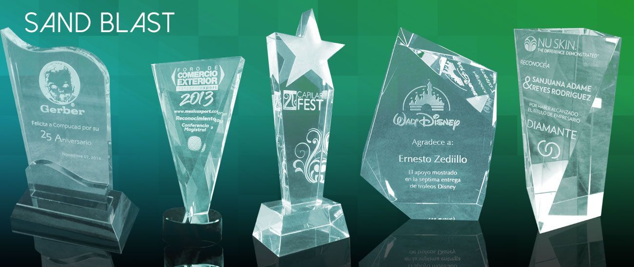 Nuestros principales productos son de cristal óptico de importación que pueden ser grabados con la mejor técnica de 3D Laser o la fina y ya clásica técnica de Sand Blast.
